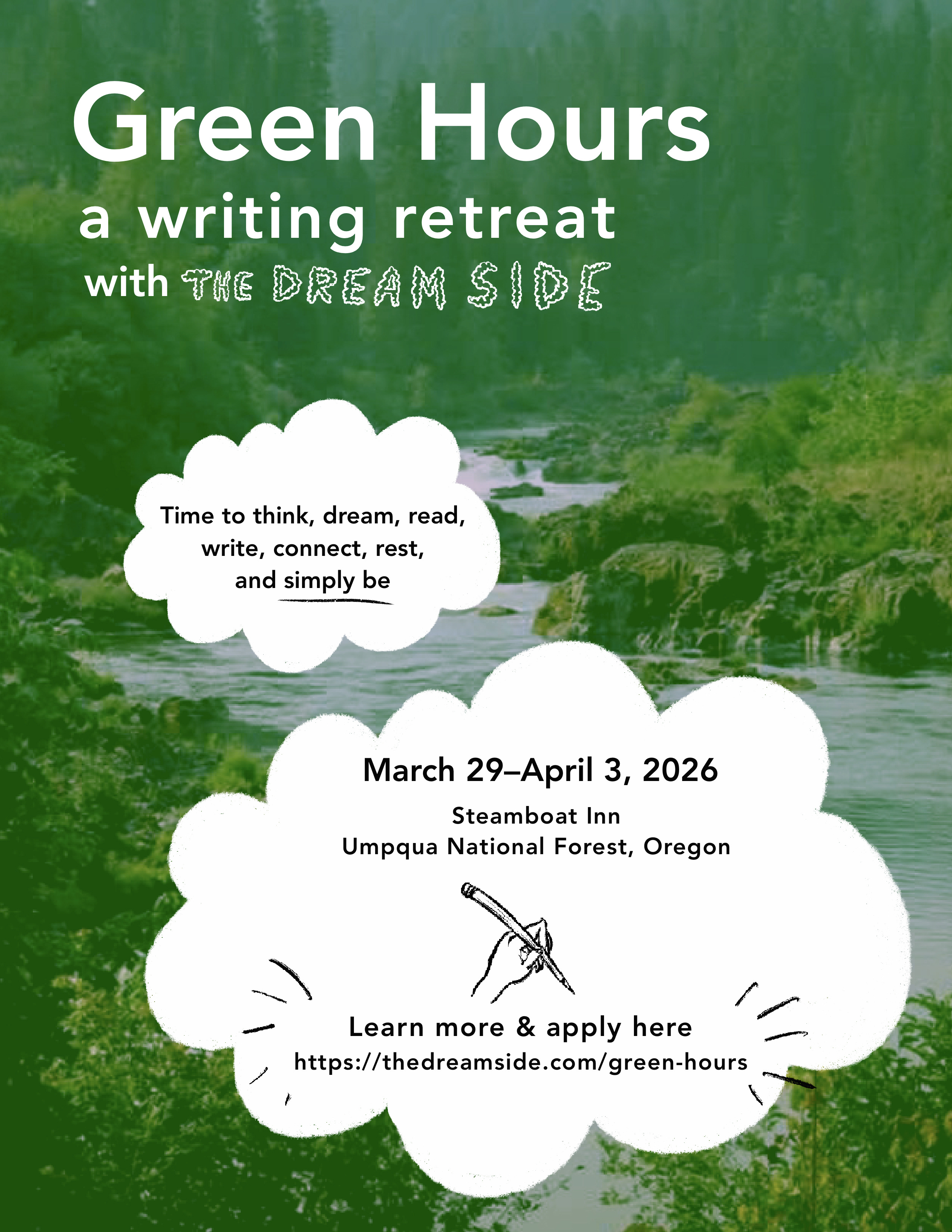 Interested in renewing your writing practice and resetting your attention? Join us in 2026 for GREEN HOURS, a five-night generative writing retreat in Oregon’s Umpqua National Forest.